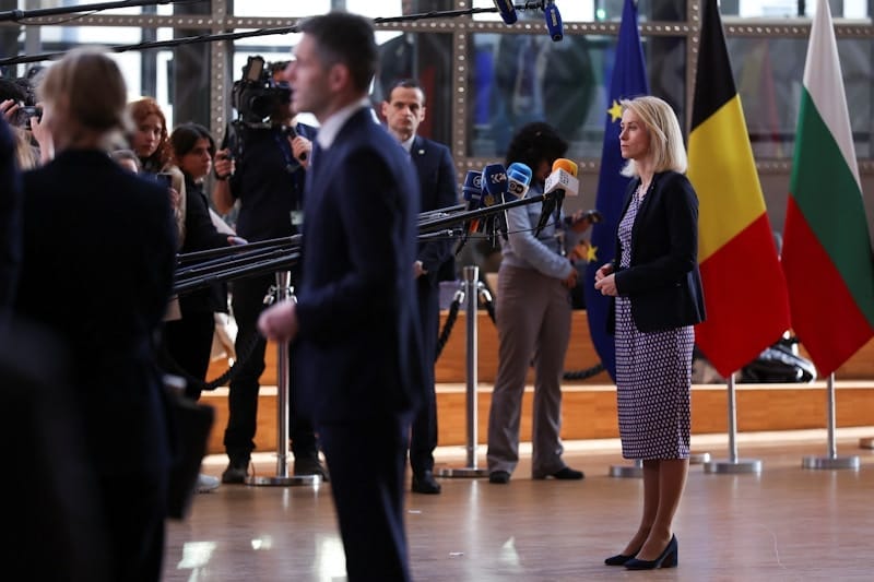 หัวหน้านโยบายต่างประเทศ EU Kallas พูดกับนักข่าวในบรัสเซลส์ก่อนการประชุมรัฐมนตรีต่างประเทศ EU