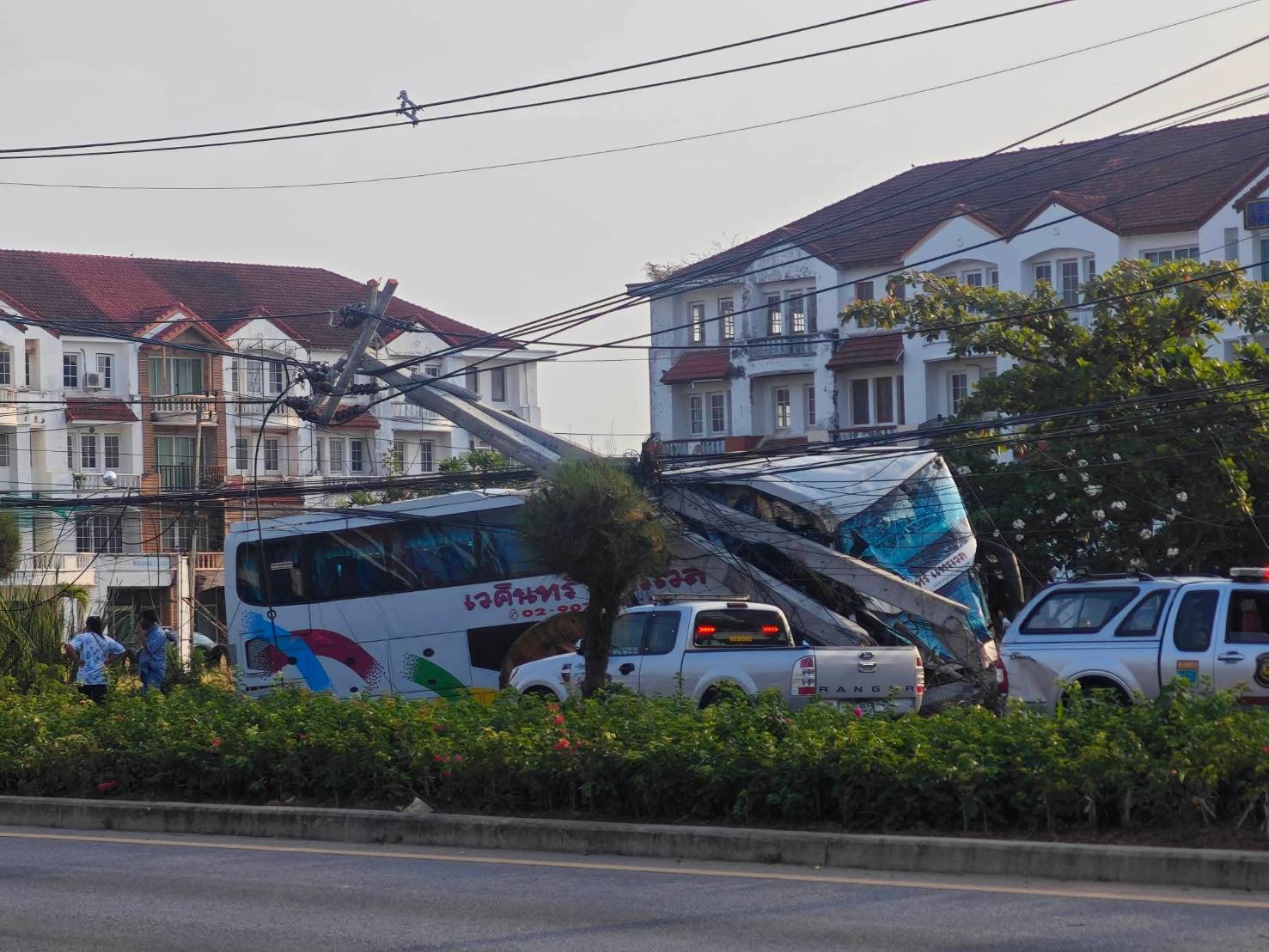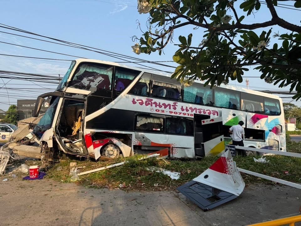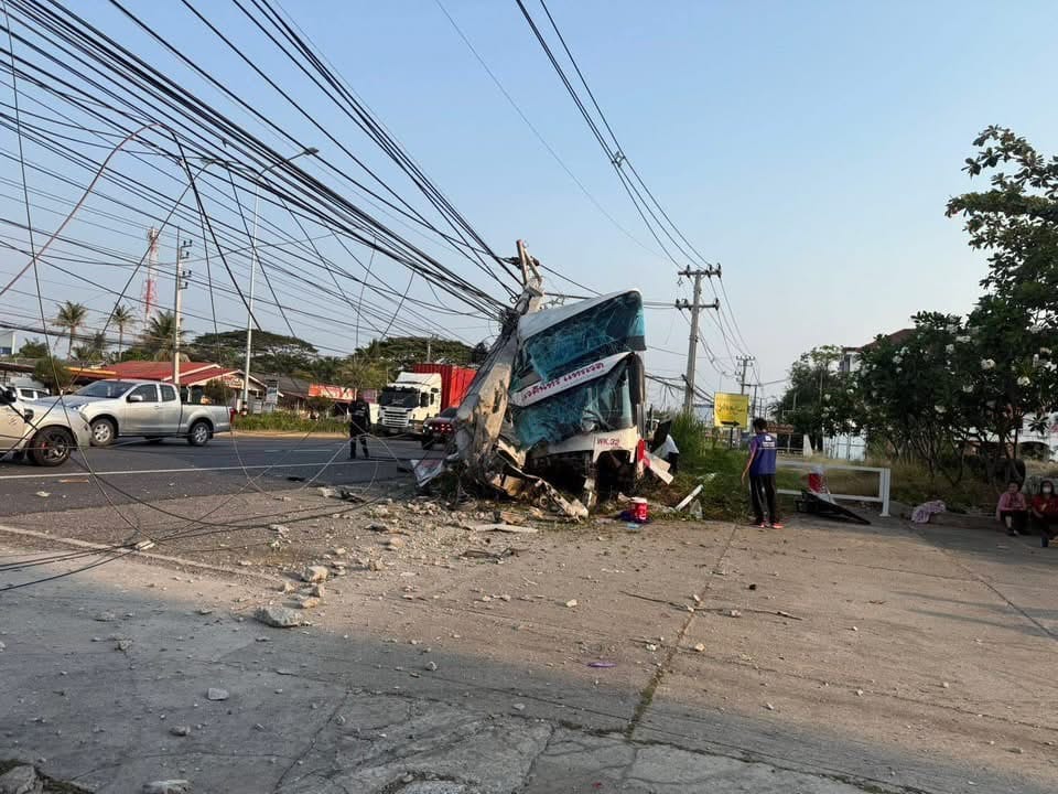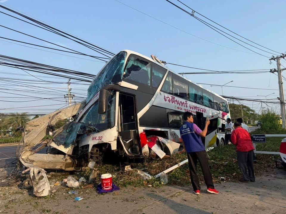 รถทัวร์โดยสารเสียหลักชนเสาไฟฟ้า จ.เพชรบุรี เจ็บหลายราย